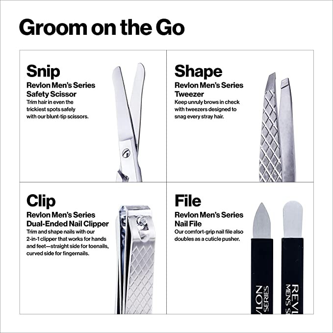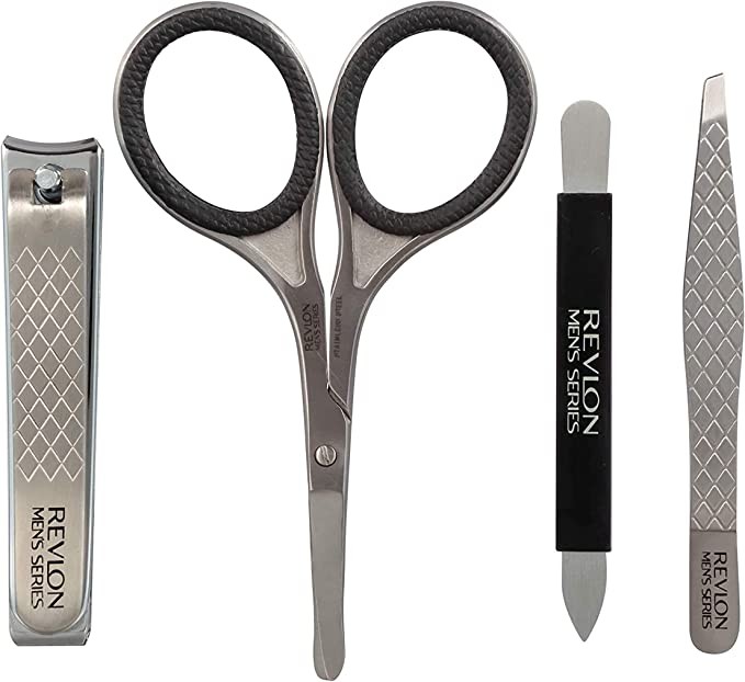 REVLON Men's Collection Dressing Set, Including Scissors, 2-in-1 Nail Clippers, Diagonal Tweezers and Nail File, Made of Stainless Steel, Set of 4