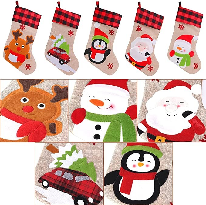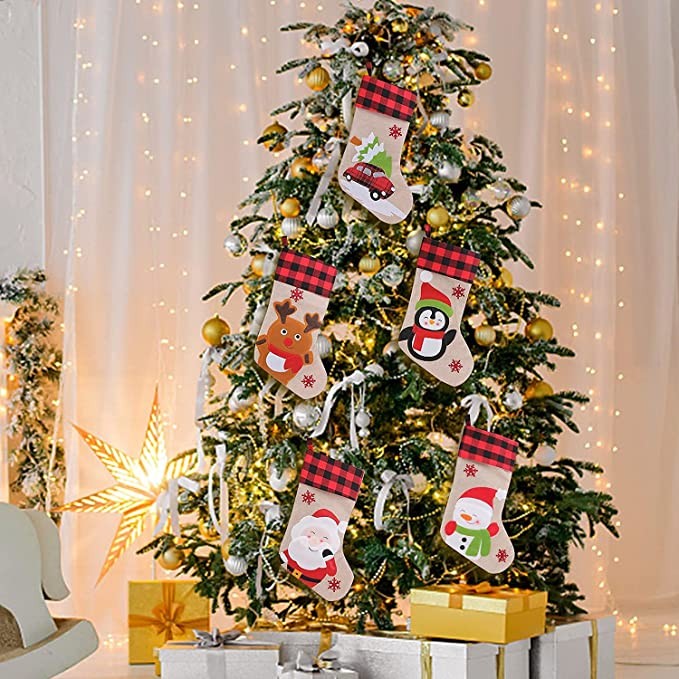 ZLKJ Christmas Stockings Classic Xmas 5 Pack Buffalo Plaid Cuff with 3D Santa Hanging Fireplace Decoration Stockings for Holiday Christmas Tree Decor Party Gift 19.69 Inches