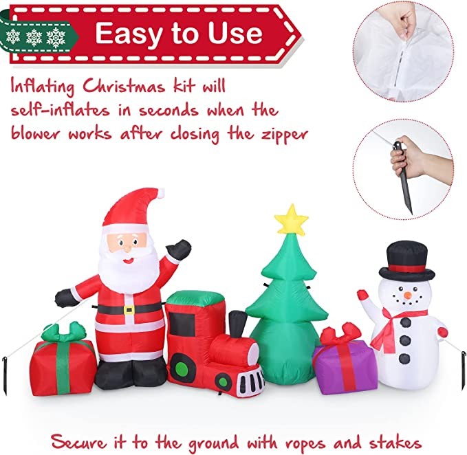 The Christmas inflatable decoration features cute shapes, which include Santa Claus, snowman, small train and tree. The Christmas inflatable decoration will attract children's attention, bringing a pleasant mood to them.