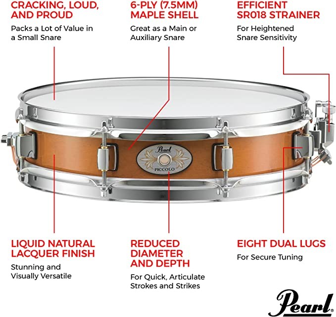 Pearl Piccolo Snare Drum 13" x 3" (Approx. 33.02x7.62 cm), 6-Ply Maple Shell, Liquid Amber (M1330114)